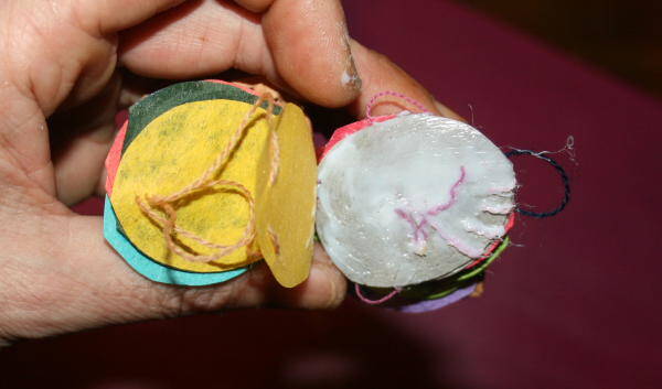 Creare libri per i bambini: un altro libretto nella noce, realizzato con foglietti e fili di cotone colorati che, sfogliando le pagine, creano piccoli giochi di linee.