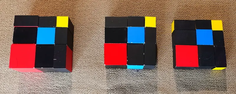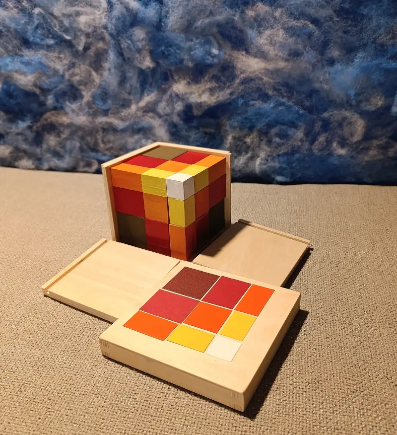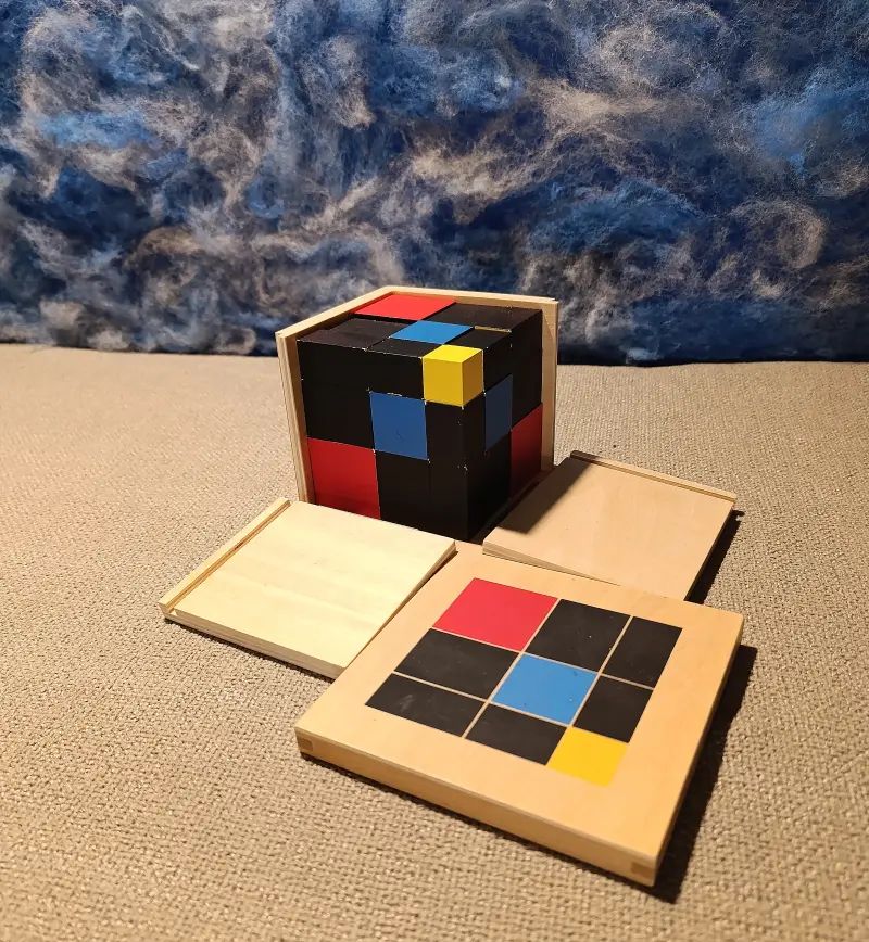 Il primo cubo, il Cubo del Trinomio, è utilizzato dai bambini a partire dalla Casa dei Bambini, e viene generalmente utilizzato come puzzle tridimensionale.