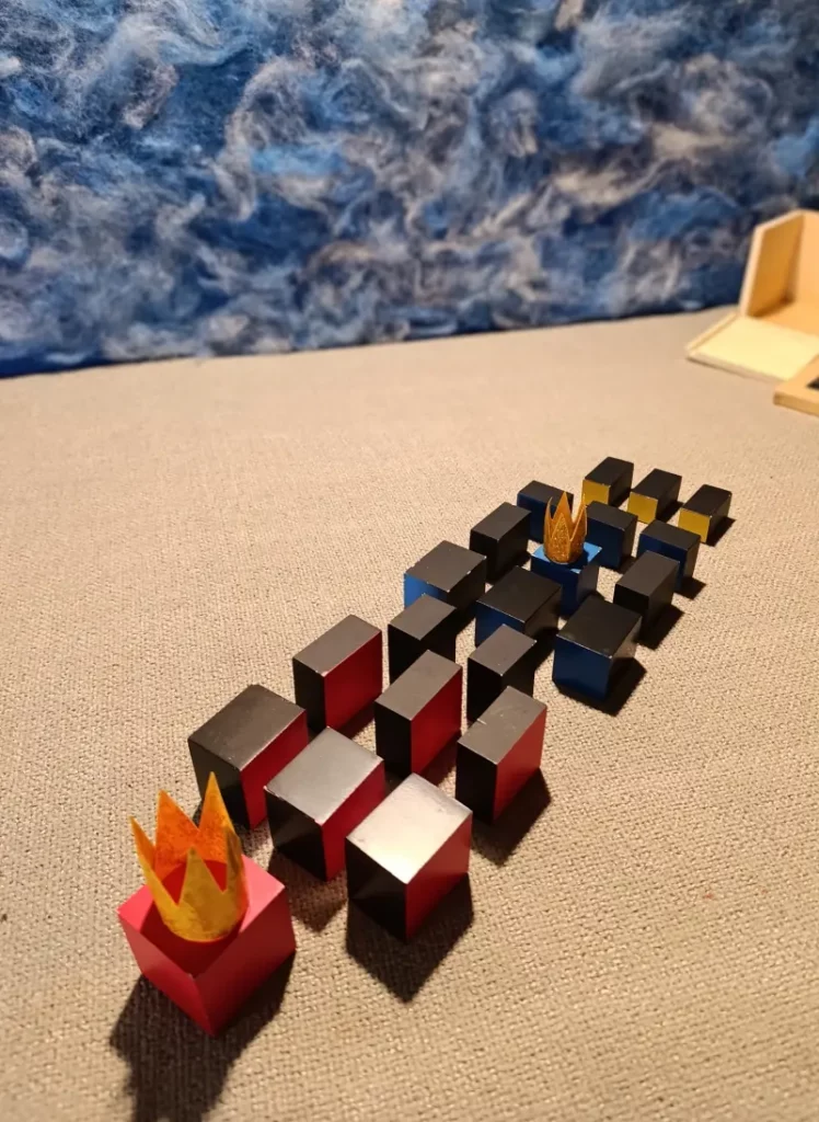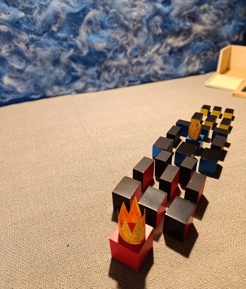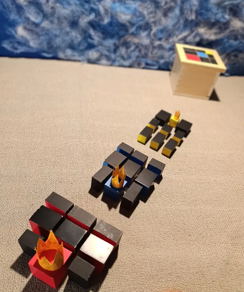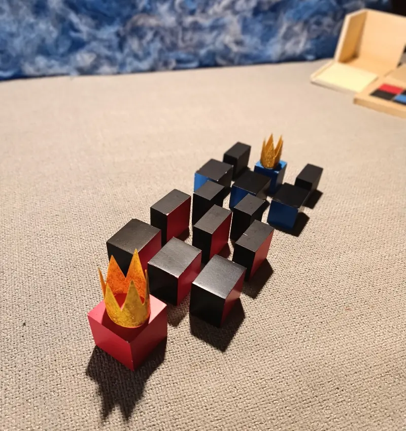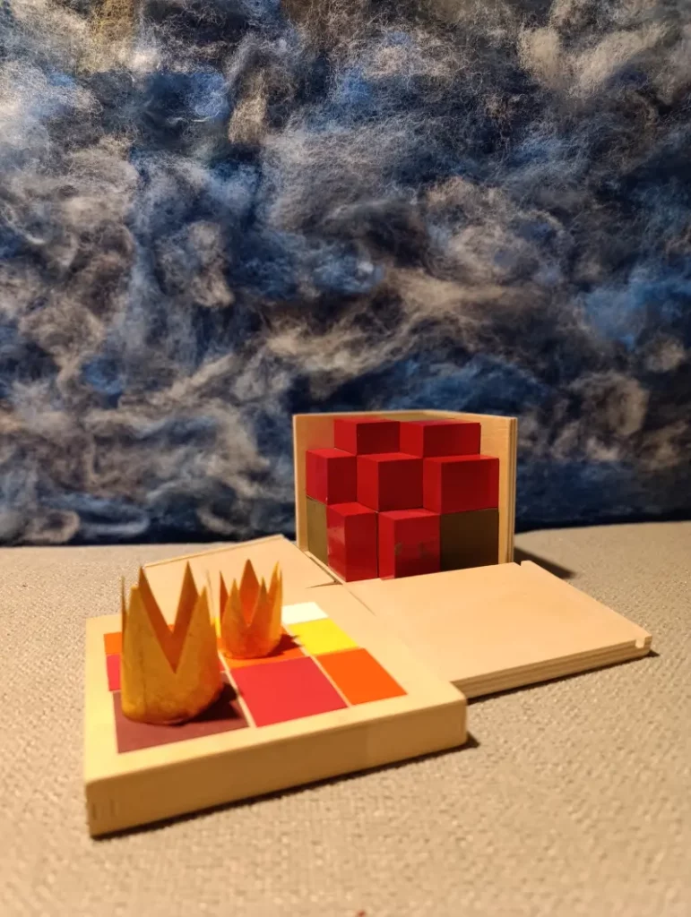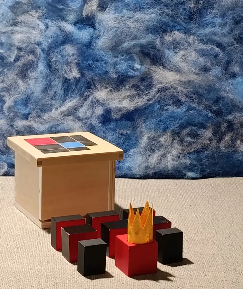 Questa storia è legata a due materiali Montessori molto specifici: il Cubo del Trinomio e il Cubo del Trinomio Gerarchico.