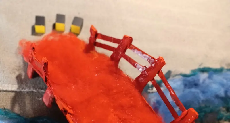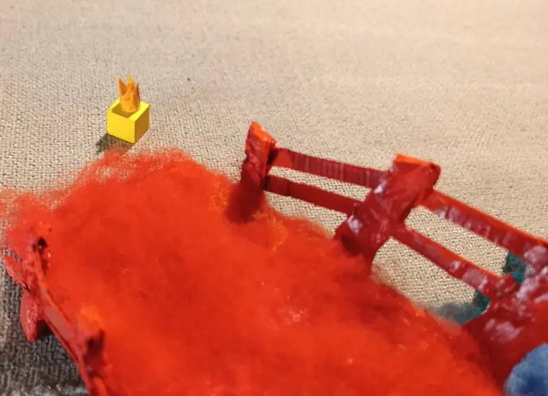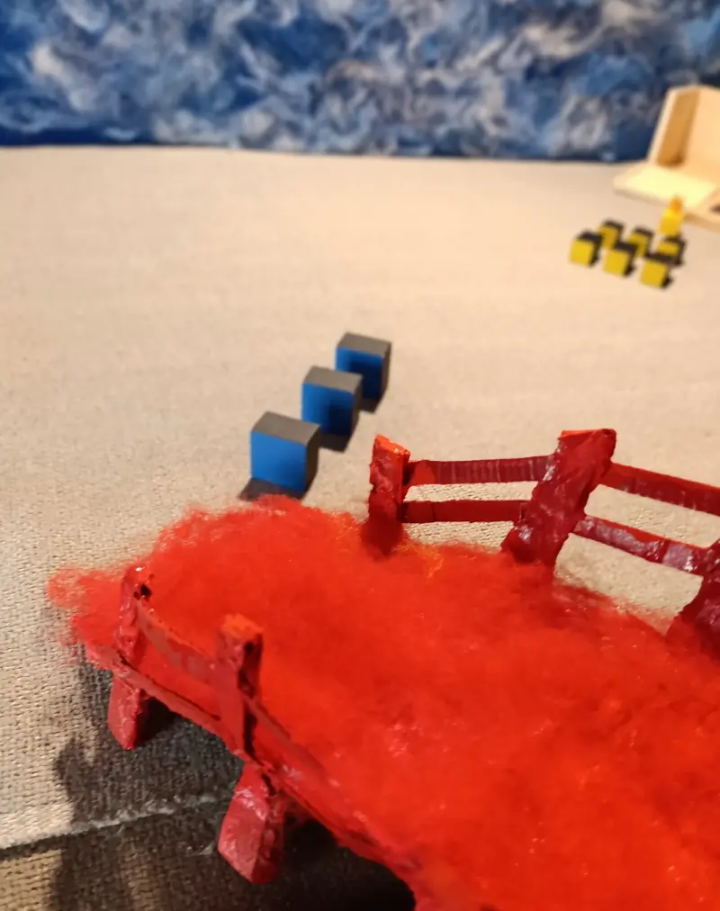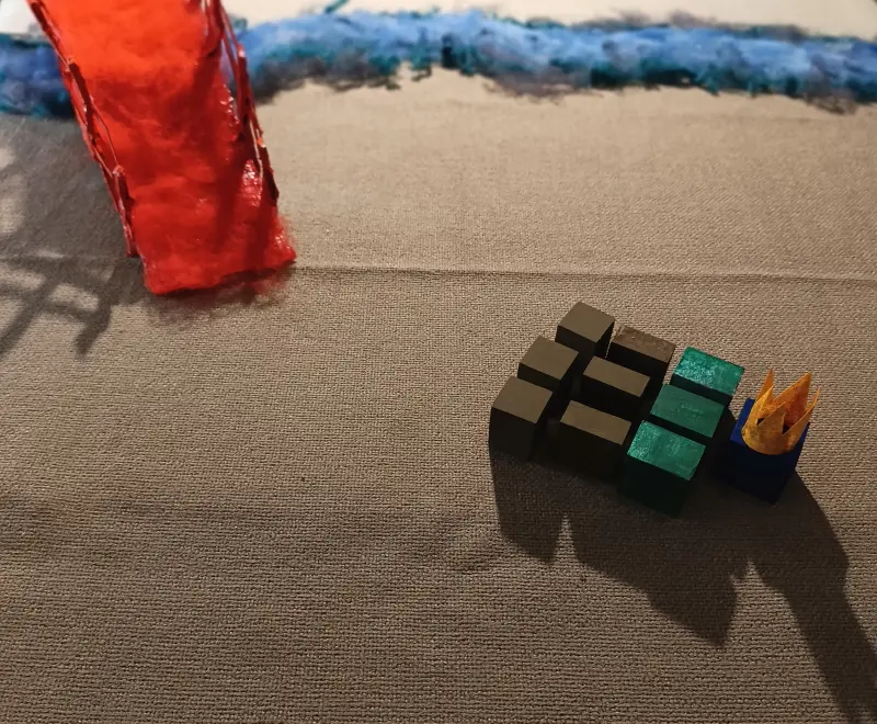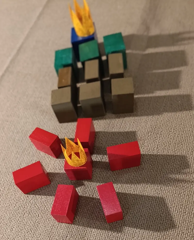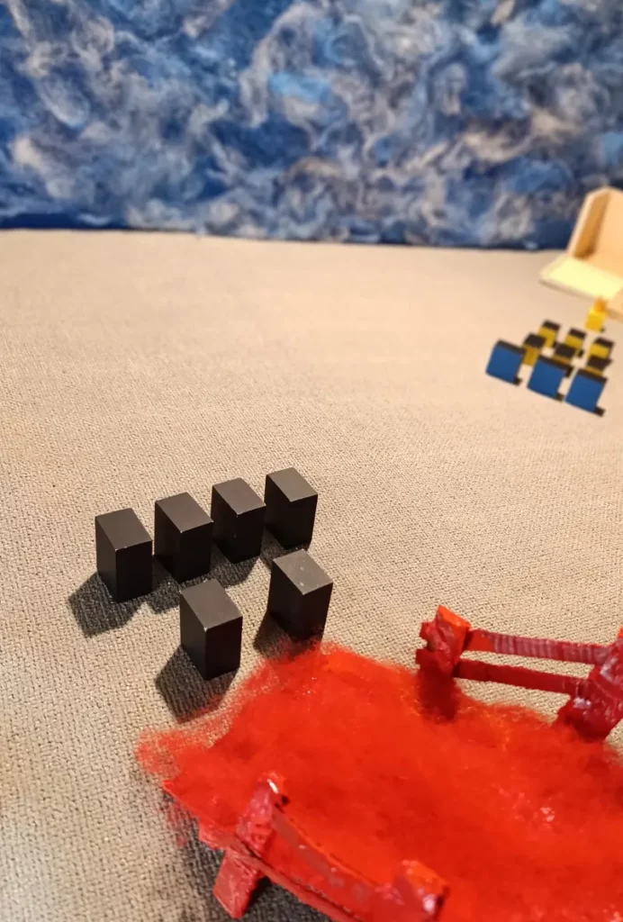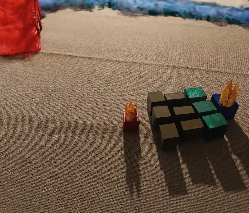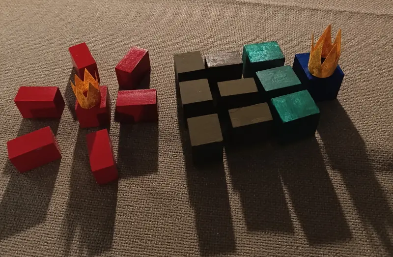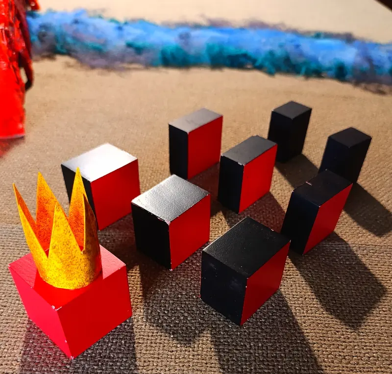 . 6 prismi con le facce quadrate dipinte di rosso. Sono chiamati i “Servitori del Re Rosso” e sono divisi in due gruppi: 3 di loro misurano 4 x 4 x 3 cm; gli altri 3 misurano 4 x 4 x 2 cm;