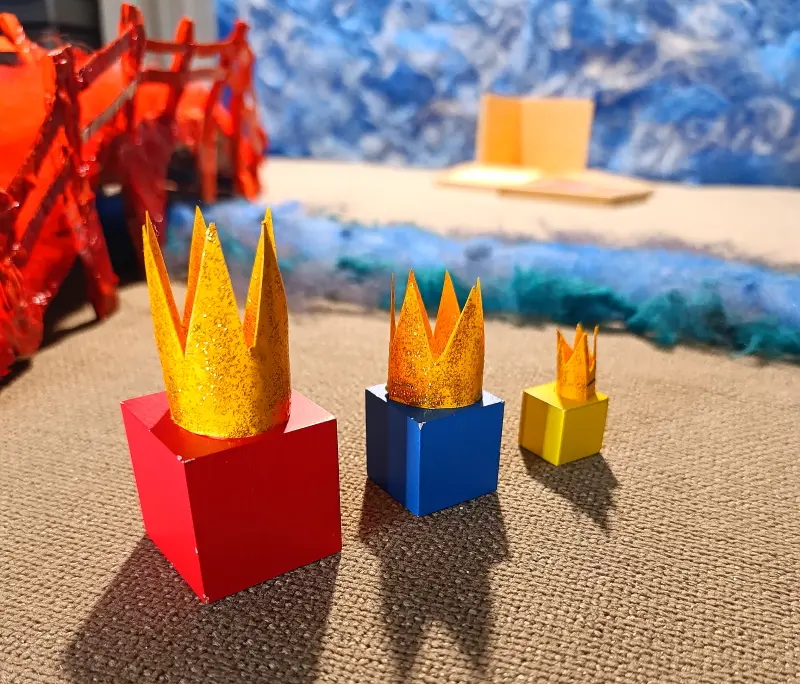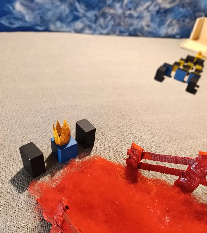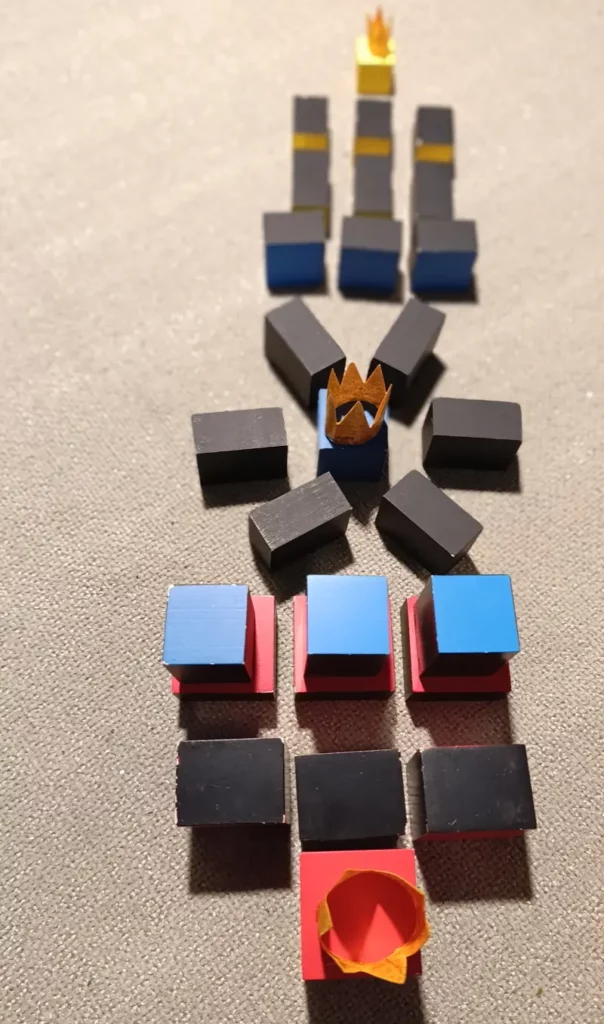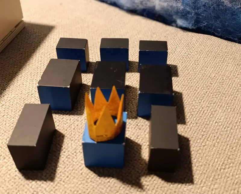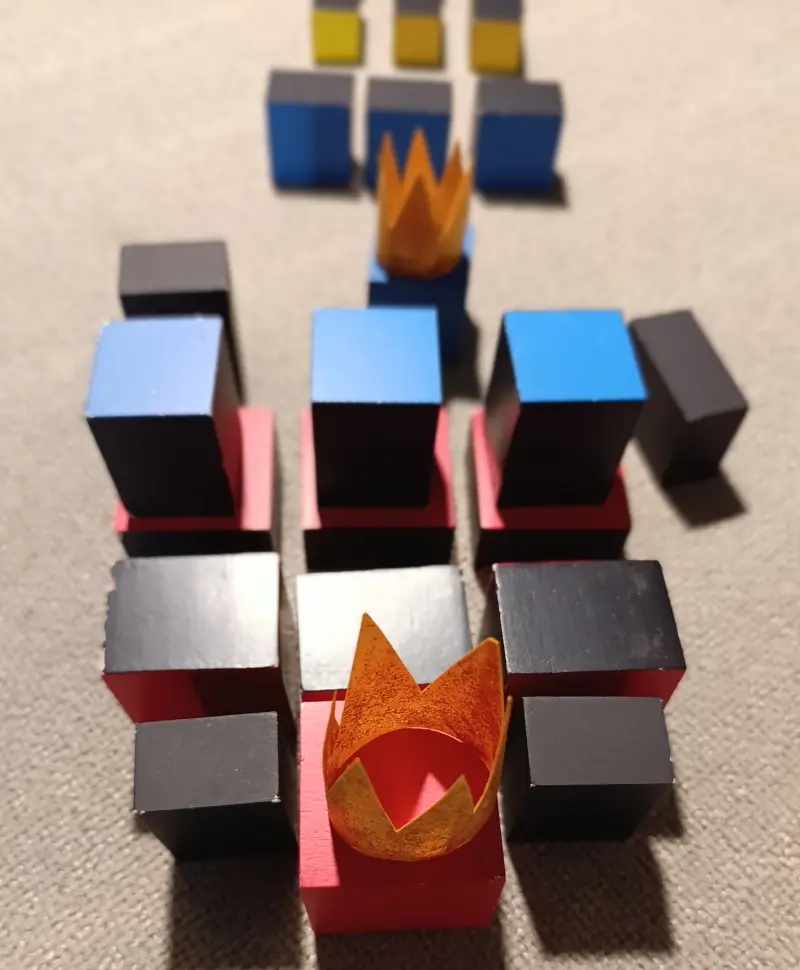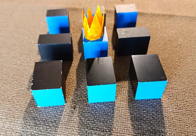. 6 prismi con le facce quadrate dipinte di blu. Sono chiamati i “Servitori del Re Blu” e sono divisi in due gruppi: 3 di loro misurano 3 x 3 x 4 cm; gli altri 3 misurano 3 x 3 x 2 cm