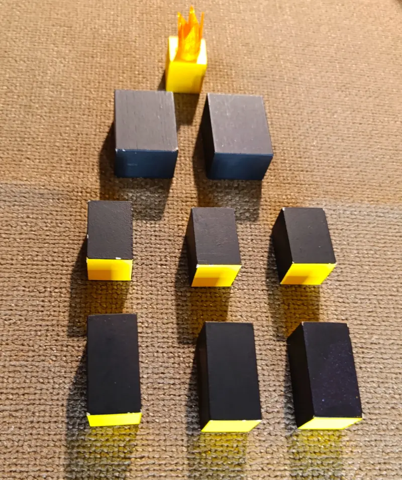 . 6 prismi con le facce quadrate dipinte di giallo. Sono chiamati i “Servitori del Re Giallo” e sono divisi in due gruppi: 3 di loro misurano 2 x 2 x 4 cm; gli altri 3 misurano 2 x 2 x 3 cm;