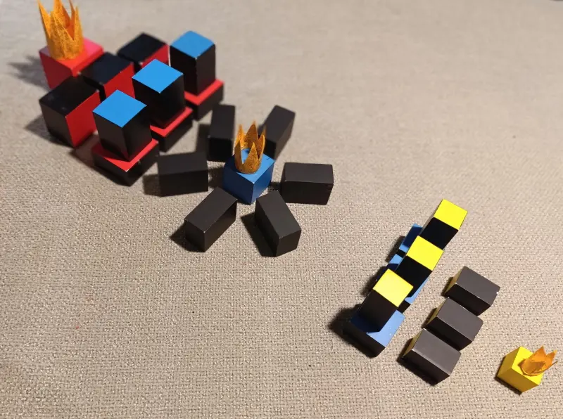 Questa storia immagina che i tre piccoli pezzi a forma di cubo siano dei re. Ognuno di loro conduce il proprio seguito a fare una passeggiata. Durante la passeggiata, si trasformano tutti, i loro colori cambiano e, in alcuni casi, cambiano anche le loro alleanze.