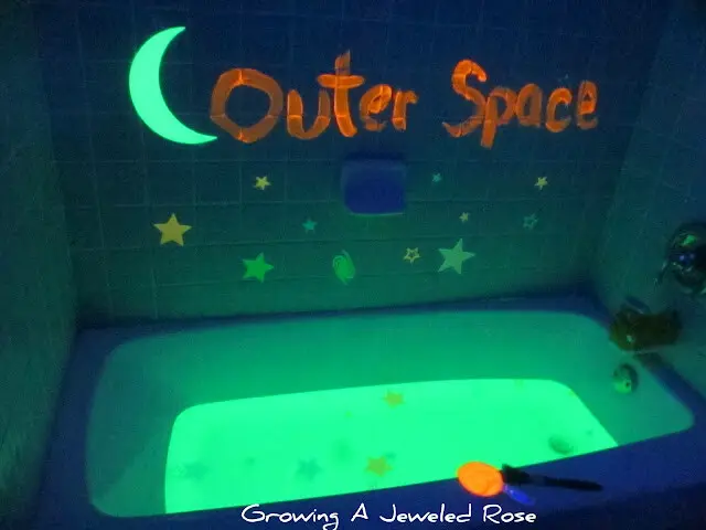 4. per illuminare soltanto un’area della casa in modo diffuso (la vasca da bagno, piuttosto che una parete o il tavolo dove si vuole giocare con la fluorescenza) posizionate la lampada il più lontano possibile e mai in modo tale che punti direttamente sulle persone (può essere semplicemente puntata verso l’alto o verso un punto della parete che non può investire il bambino direttamente) e anche per le festine effetto discoteca a tema “glow in the dark” non servirà una grande potenza, ma piuttosto che la stanza sia molto buia;